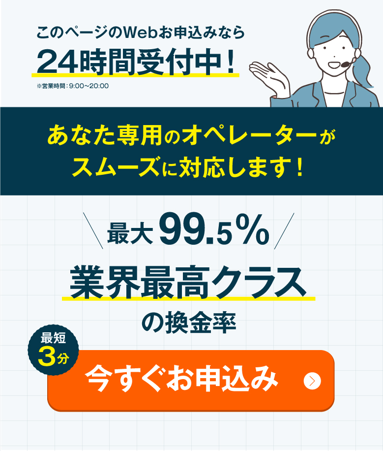 あんしんクレジットは業界随一のお振込みスピードと高い換金率に自信を持っております。常に市場調査を行っておりますが、万が一他社よりも悪い条件だった場合は遠慮なく仰ってください。